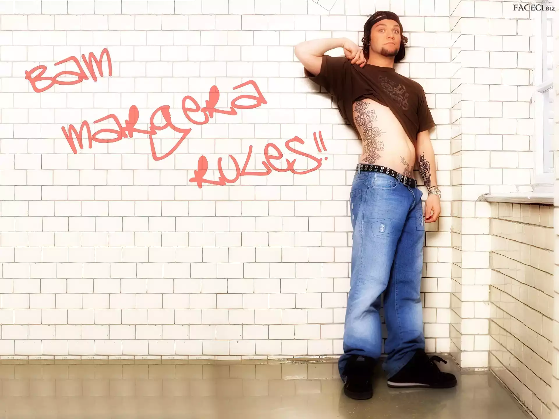 kurtka, Bam Margera, rozpięta zegarek, Bam Margera, deskorolka okulary, Bam Margera, butelka okulary, Bam Margera, twarze t-shirt, Bam Margera, brązowy włosy, Bam Margera, ciemne